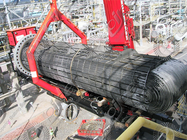 在每次拆裝浮頭的過(guò)程中也有一些影響密封效果的因素,常見(jiàn)的問(wèn)題如下: (1)在抽裝管束和拆裝浮頭法蘭的過(guò)程中沒(méi)有保護(hù)好密封面,使密封面邊緣磕碰受損或在密 封面上形成劃痕; (2)安裝前浮動(dòng)管板和浮頭法蘭密封面沒(méi)有進(jìn)行徹底清理或清理的不夠干凈,或存有異物,尤 其是堅(jiān)硬物體; (3)安裝時(shí)墊片的變形沒(méi)有矯正,浮頭法蘭與浮動(dòng)管板密封面不對(duì)正,墊片不在有效密封限定 區(qū)域內(nèi),或墊片包裝物沒(méi)有去掉; (4)墊片加裝時(shí)沒(méi)有保護(hù)措施,或不按操作規(guī)程操作。墊片放在浮頭法蘭的凹槽內(nèi),應(yīng)用黃油 粘好,使其不致于脫離凹槽。由于浮頭法蘭和浮頭拱蓋上的吊耳不在重心,浮頭法蘭在安裝時(shí),法 蘭面與浮動(dòng)管板面不平行,很容易碰傷墊片,如果沒(méi)有保護(hù)措施就會(huì)使墊片受到損傷; (5)多管程浮頭式換熱器的浮頭拱蓋內(nèi)設(shè)有分程隔板,當(dāng)隔板發(fā)生變形后如果不及時(shí)矯正,隔 板密封邊緣就進(jìn)不到浮動(dòng)管板上的密封槽內(nèi),從而使密封失效; (6)換熱器管束發(fā)生內(nèi)部泄漏后,一般要用堵頭把泄漏的換熱管堵住,當(dāng)發(fā)生泄漏的換熱管位 于最外側(cè)與浮動(dòng)管板密封面離得很近時(shí),由于堵頭過(guò)長(zhǎng)剩在換熱管外邊的部分就會(huì)直接頂在浮頭 法蘭的拱蓋上,使浮頭法蘭密封面壓不到墊片上造成此處密封失效; (7)浮頭法蘭安裝后在緊固螺栓的過(guò)程中沒(méi)有按照規(guī)范進(jìn)行操作,緊固的順序不對(duì)或預(yù)緊力 的大小不均勻,甚至漏緊。